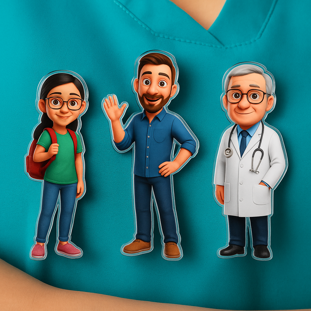 Nuestros broches/pins personalizados están hechos en metacrilato impreso a todo color, con ilustraciones personalizadas basadas en tus fotos, transformadas al encantador estilo cartoon.